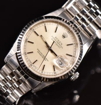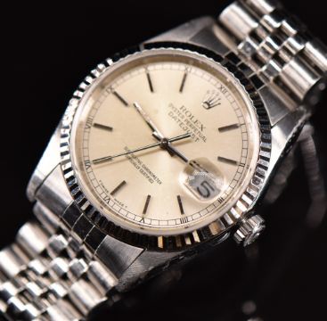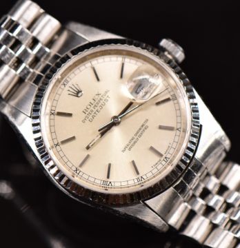 Rolex Oyster Perpetual Datejust gentleman's automatic wristwatch ref. 16234 with date aperture, luminous tipped steel hands and baton hour markers, Roman numerals to the minutes track, silver dial, stainless steel case and signed calibre 3135 movement, on stainless steel bracelet, case diameter 36mm, serial number T490468.