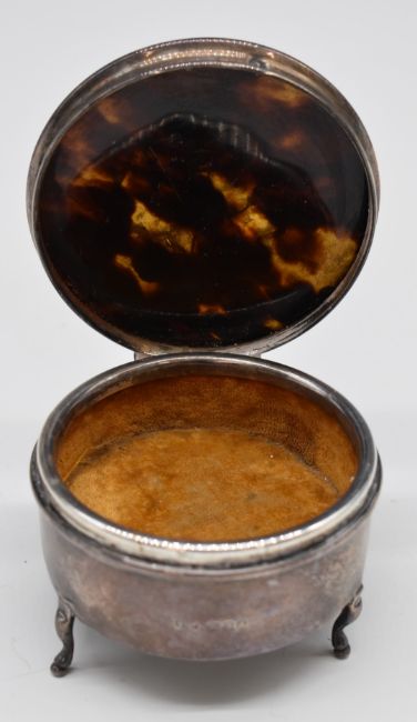 George V hallmarked silver and tortoiseshell jewellery casket raised on three legs, London 1916, maker's mark rubbed, diameter 8.5cm