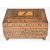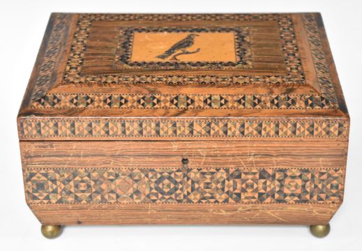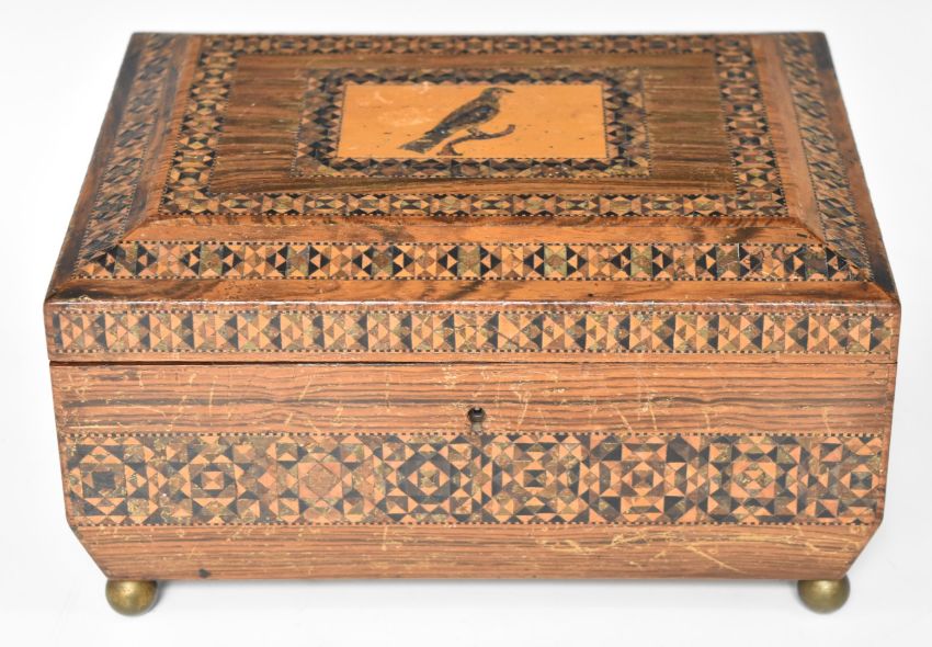 Tunbridgeware work box and contents including Tunbridge cotton reels, raised on four brass ball feet, W24 x D19 x H14cm