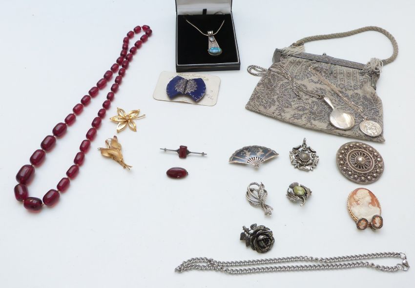 A collection of jewellery including miniature silver hand mirror, Miracle pendant, filigree brooch, silver St Christopher, Siam silver brooch, carnelian agate, cameo brooch, silver necklace set with labradorite etc