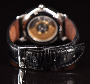 Frederique Constant Classics GMT Dual Time gentleman's automatic wristwatch ref. FC-325X3P5/6 with subsidiary dual time dial, date aperture, blued Breguet hands, black Roman numerals, silver dial, stainless steel case, clear exhibition case back and signed movement, on black leather strap, case diameter 38mm, serial number 1359272.