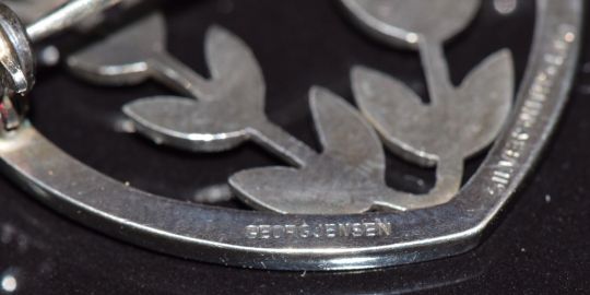 Georg Jensen silver brooch in the form of a heart with foliate decoration, marked Georg Jensen 242, and a white metal fly brooch set with two moonstones