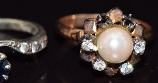 A 9ct gold ring set with sapphires and spinel and a yellow metal ring set with a pearl, 7g, sizes P & K