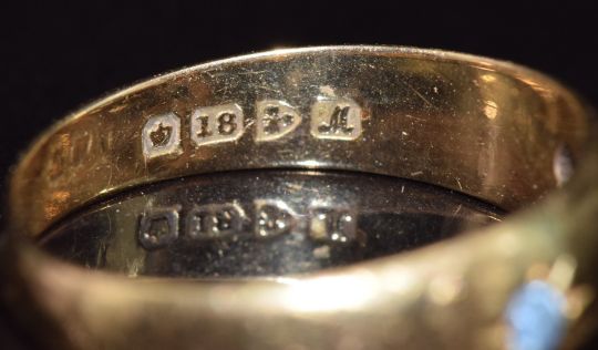 An 18ct gold ring set with a diamond and sapphires in star settings, Chester 1912, 2.1g, size P