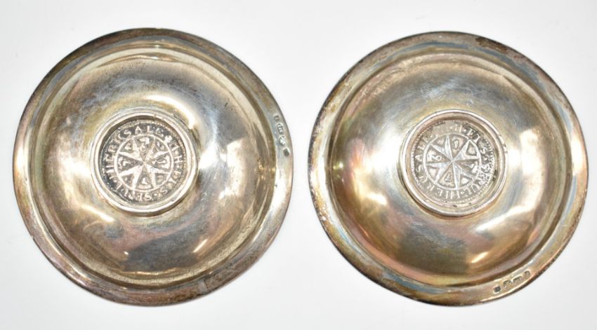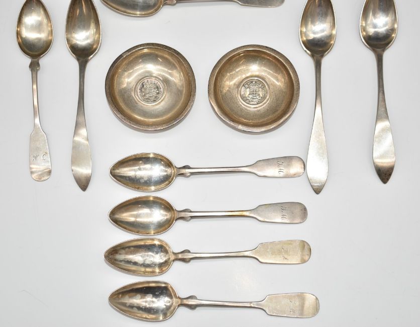 Twelve German silver teaspoons, some marked 800, others 12 and others 13, together with two Maltese silver pin dishes, diameter 6.5cm, weight 267g