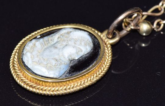 A c1900 15ct gold pendant set with an agate cameo (5g) on 9ct gold chain made up of sphere and cross links  with barrel clasp, 6.1g, 42cm long