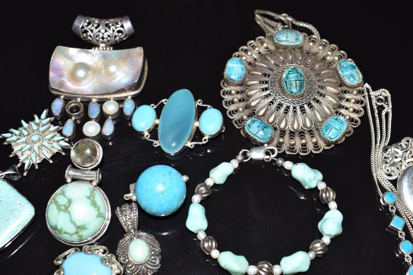 A collection of silver necklaces/ chains and pendants set with turquoise and faux turquoise