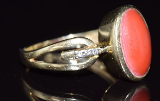 A 14k gold ring set with a coral cabochon and diamonds to the shoulders, 4.6g, size N