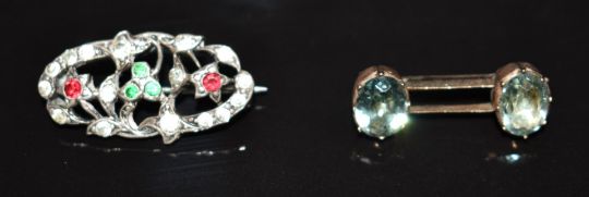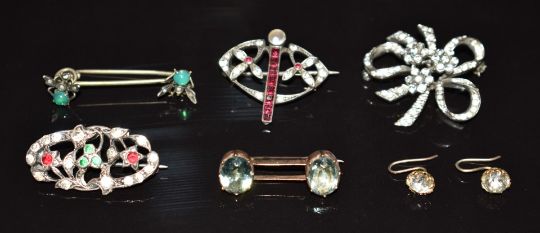 Art Deco silver brooch set with paste and mother of pearl, yellow metal Victorian brooch set with foiled paste, two other silver brooches set with paste, a pair of earrings set with paste and a brooch in the form of two flies