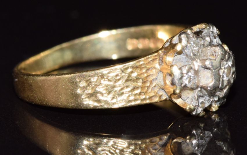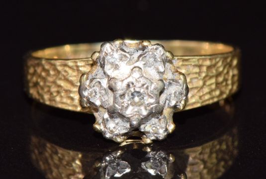 A 9ct gold ring set with diamonds in a cluster with textured shoulders, 2.8g, size L