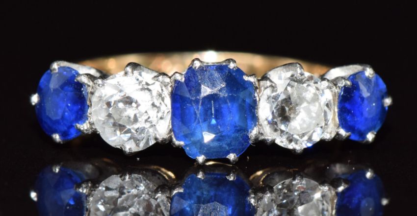 A c1920 18ct gold ring set with sapphires and diamonds, the centre sapphire approximately 0.6ct and two diamonds approximately 0.3ct each, 2.9g, size J