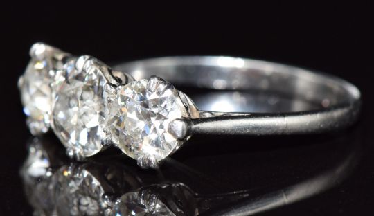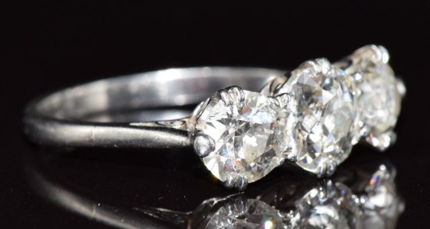 Art Deco platinum ring set with three diamonds, the largest approximately 1.2ct and remaining two 0.8ct, 4.2g, size P
