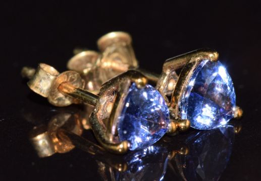 A pair of 9ct gold earrings set with trilliant cut tanzanites, each approximately 0.5ct, 1g