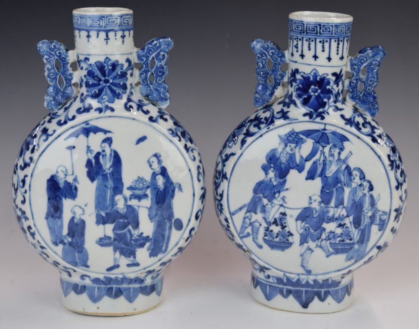 Pair of 19thC Chinese twin handled blue and white moon flasks, each decorated with four separate court scenes, height 27.5cm