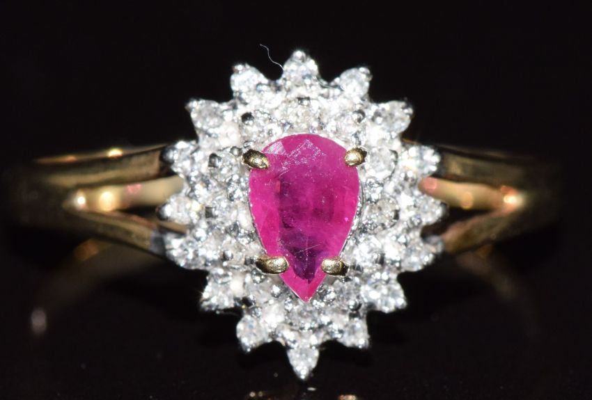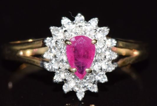 A 9ct gold ring set with a pear cut ruby and diamonds, 2g, size Q
