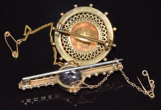Edwardian brooch set with amethyst and seed pearls and a Victorian brooch