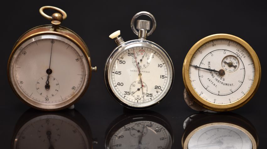 Nero Lemania keyless winding open faced military stopwatch with black Arabic numerals, white dial and silver plated case marked to the back '0552/521-9482 1397/71' below ministry broad arrow, case diameter 51mm together with a Rolls-Royce Motor-Cars Morris's Measuring Instrument and a Munsey of Cambridge stopwatch.
