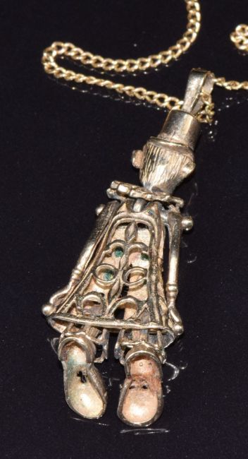 A 9ct gold reticulated clown pendant set with paste (5.3g) on 18ct gold chain 3.8g, 52cm long