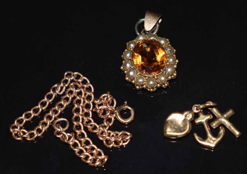 A yellow metal pendant set with a citrine and split pearls, a 9ct gold charm/ pendant and 9ct gold bracelet (4.5g)