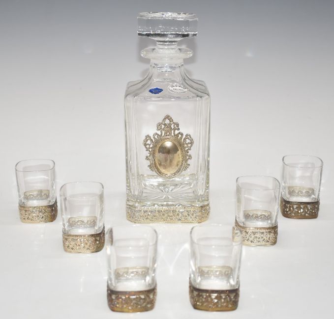 Cased set of silver mounted decanter and six glasses, all marked 925, width of case 39cm