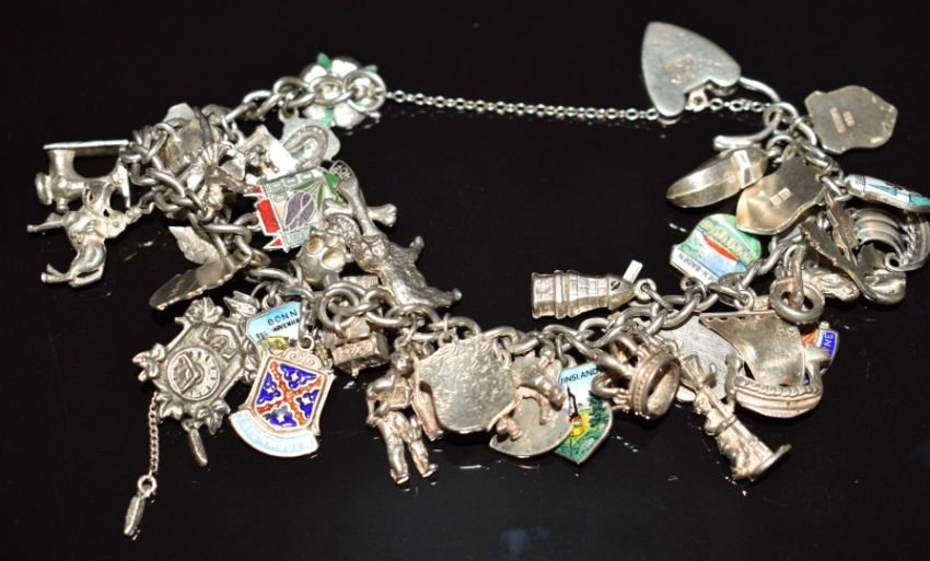A silver charm bracelet with charms including enamel shields, a flower opening to reveal a bee, cat, train, dog, thistle, etc