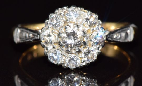 An 18ct gold ring set with diamonds in a platinum cluster setting, 3g, size J