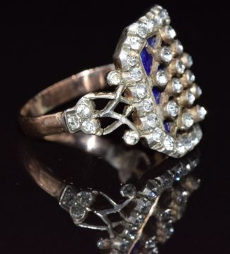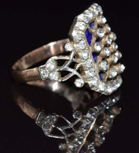 A late Georgian/ early Victorian gold and silver ring set with blue guilloché enamel and paste, 4.2g, size L