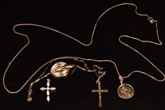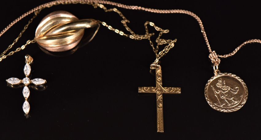 A 9ct gold bi-coloured pendant, 9ct gold St Christopher, two 9ct gold cross pendants, and two 9ct gold chains, 73cm and 40cm long, 8.7g
