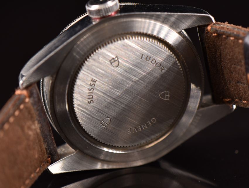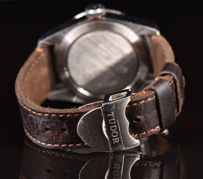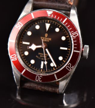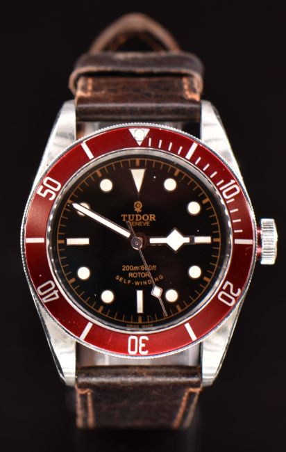 Tudor Black Bay Heritage gentleman's automatic diver's wristwatch ref. 79220 with luminous rose gold hands and hour markers, black dial, red bezel, stainless steel case and ETA 2824 movement, on brown leather strap, case diameter 41mm, serial number J969442.
