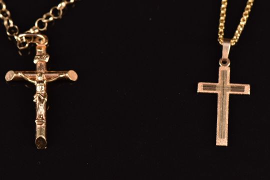 Two 9ct gold crosses and two 9ct gold chains, 11.5g, 50cm and 51cm long