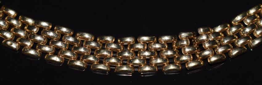 A 9ct gold necklace made up of domed rectangular links, 25.6g, 47cm long