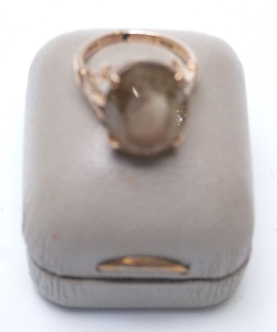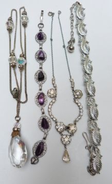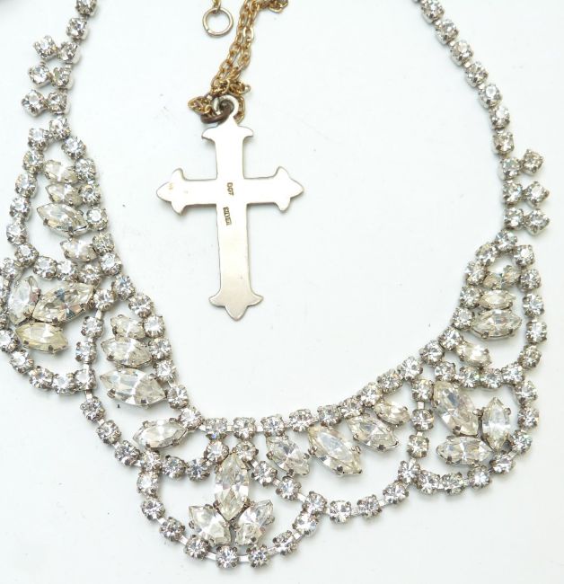 A collection of jewellery including vintage brooches, silver brooch, 9ct gold ring set with quartz (5.5g), Czecho-Slovakia pen knife in the form of a toucan, diamanté necklace, silver ring, 9ct rose gold necklace with brass clasp (6.9g), etc