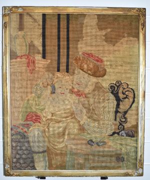 Three 19thC embroideries comprising Jesaias 25.9 in satinwood frame, another religious with angel in rosewood frame and another man with pipe in fur hat, largest 61 x 50cm