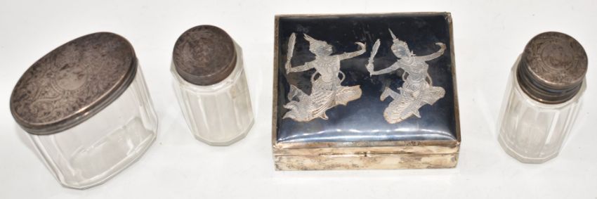 Three hallmarked silver mounted glass dressing table bottles and a Thai silver cigarette box marked Bangkok sterling to base, width 10.5cm