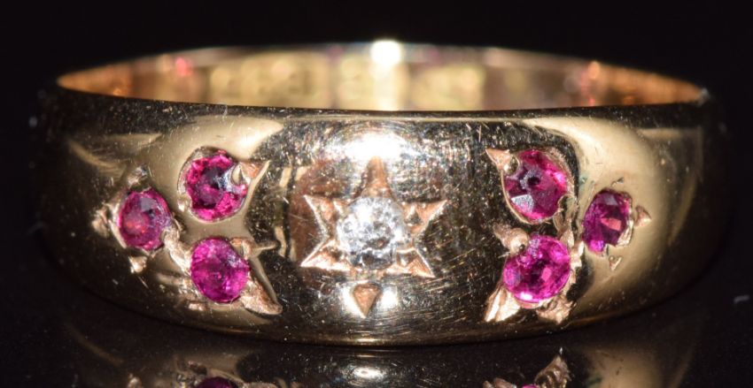 A 9ct gold ring set with a diamond and rubies, 2.4g, size N