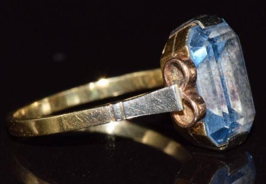 An 18ct gold ring set with an emerald cut blue topaz, 3.4g, size O