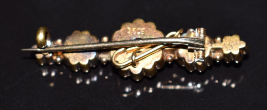 Edwardian 15ct gold brooch set with a diamond and seed pearls and a 9ct gold Victorian brooch, 7.2g
