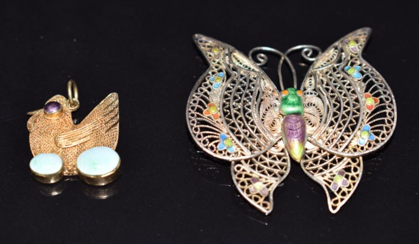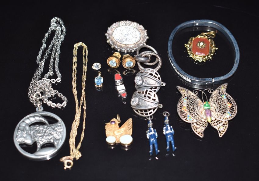 Links of London pendant, Victorian silver brooch (Birmingham 1881), Danish pewter pendant, filigree butterfly pendant, 9ct gold chain (1.7g), etc