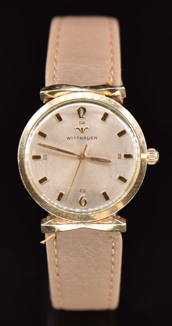 Wittnauer gentleman's wristwatch with gold hands and hour markers, silver dial, gold plated case and mechanical movement, on brown leather strap, case diameter 30mm.