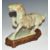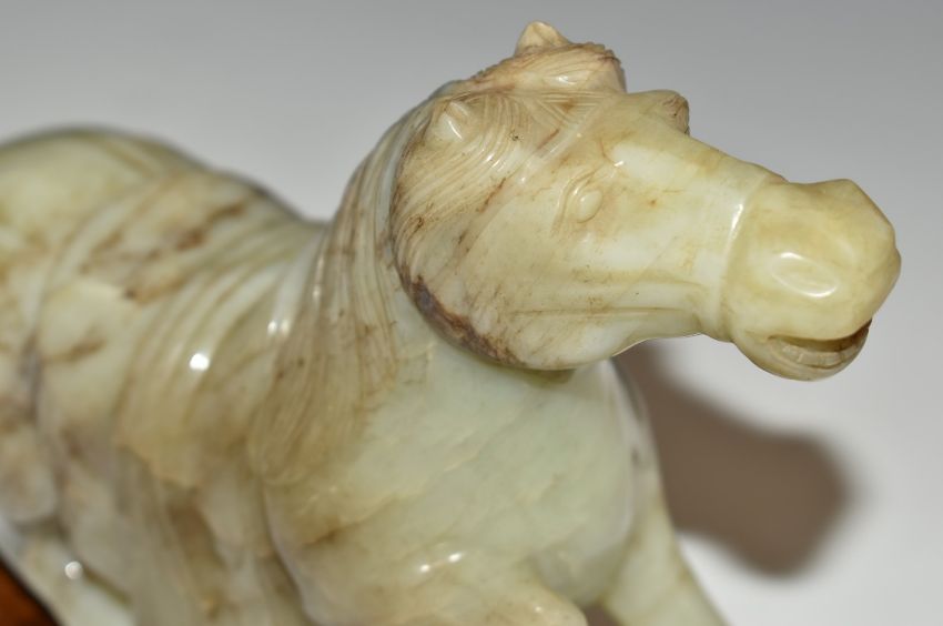 Chinese carved jadeite or similar hardstone horse with wooden base, 18cm tall.
