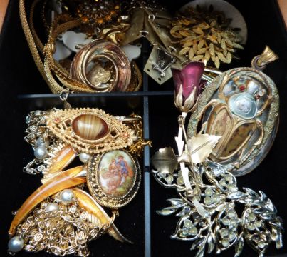 A collection of costume jewellery including Jewelcraft, vintage brooches, cultured pearls, coins etc