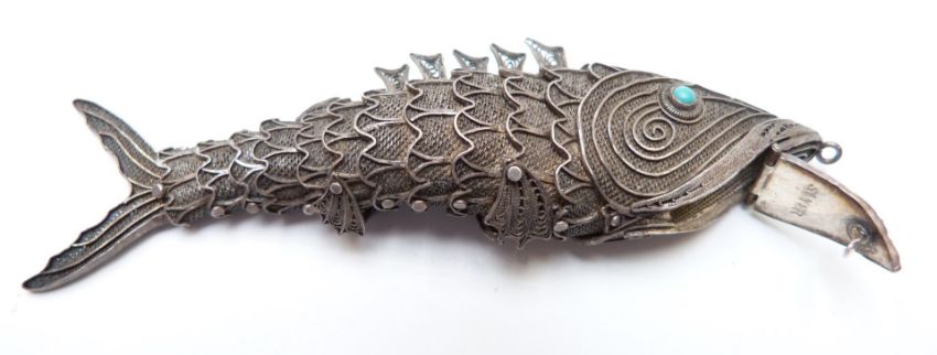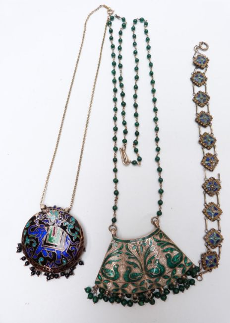 A large silver filigree fish, two cloisonné bangles, two enamel pendants, Chinese earrings, silver chain, etc