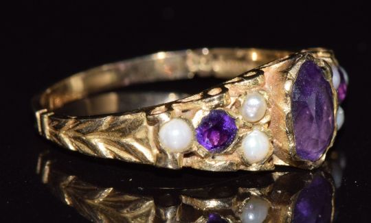 A 9ct gold ring set with amethysts and pearls, 3g, size O