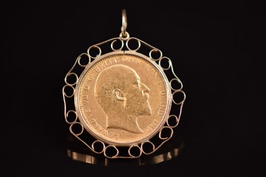 Edward VII 1904 gold full sovereign with Perth mint mark, in 9ct gold mount, 10g