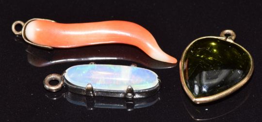 Victorian yellow metal charm/ pendant set with peridot, Victorian pendant set with an opal and another Victorian pendant set with coral