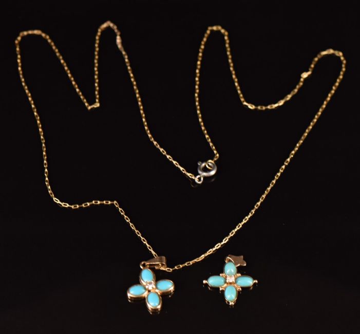 Two 14k gold pendants set with faux turquoise on 14k gold chain 2g, 60cm long
