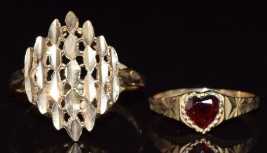 A 9ct gold ring with marquise shaped design (1.9g, size P) and a 9ct gold ring set with a heart cut garnet, 1.1g, size F