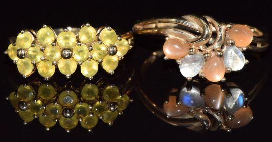 A 9ct gold ring set with moonstones and a 9ct gold ring set with paste, 4.3g, sizes N & J