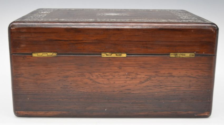 19thC mother of pearl inlaid rosewood travelling / vanity box with fitted interior, campaign brass handles, secret drawer, removable easel back mirror and VR cipher to the lock, W33 x D23.5 x H16cm
