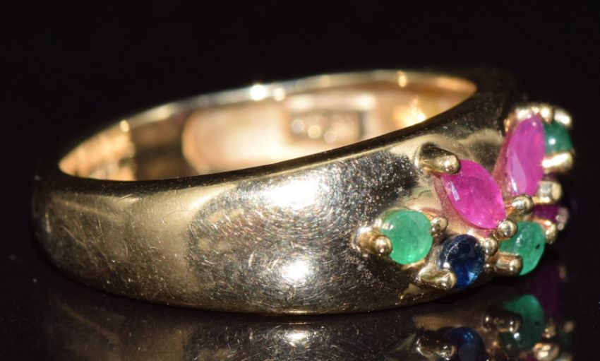 A 9ct gold ring set with rubies, sapphires and emeralds, 3.1g, size J